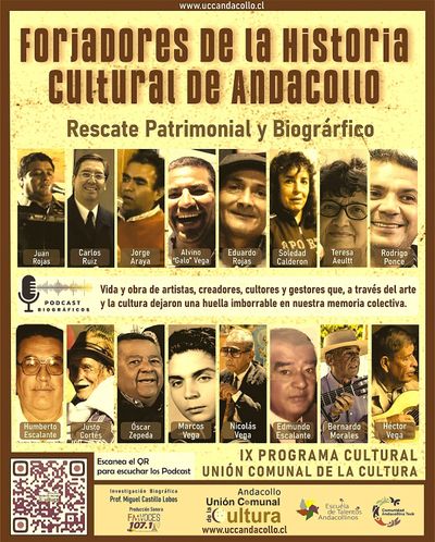 La Unión Comunal de la Cultura se enorgullese en presentar un recorrido por las vidas y legados de artistas, cultores y gestores que han marcado la historia reciente de Andacollo desde la memoria popular y el patrimonio inmaterial. A través de una investigación biográfica desarrollada por el profesor Miguel Ángel Castillo Lobos, este ciclo impulsado por la Unión Comunal de la Cultura rescata historias muchas veces ausentes de los relatos oficiales, pero fundamentales para comprender la identidad cultural andacollina y proyectarla hacia nuevas generaciones.